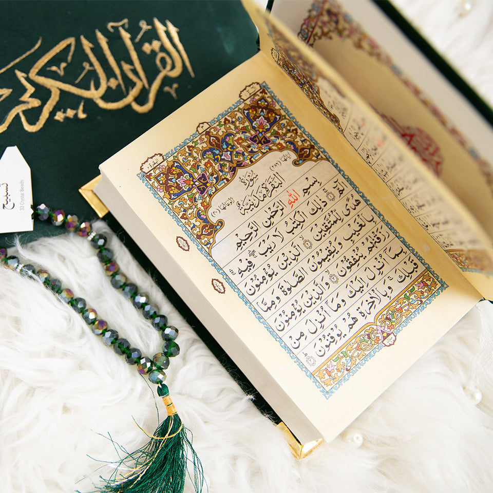 A Quran Ghilaf/Cover: Custom-made with your name in elegant Arabic script, this exquisite cover adds a personal touch to your Holy book.