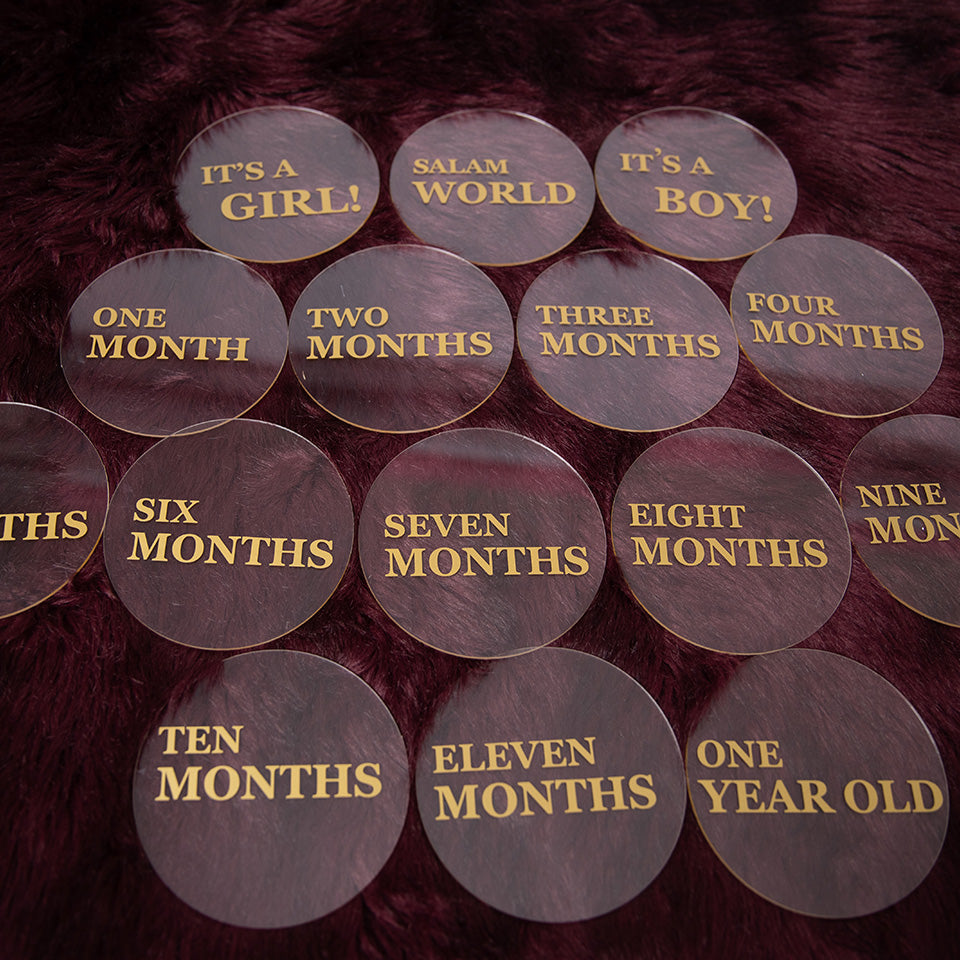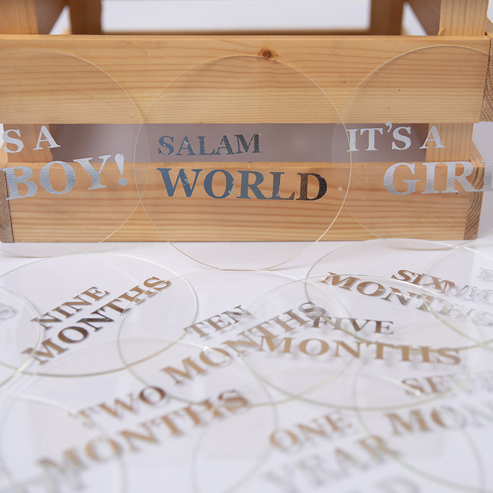 Celebrate each milestone of your baby's first year with our Transparent/Clear Acrylic Discs. Each disc features a unique cut down of vinyl labels that allows the elegance of the acrylic to shine through. Perfect for documenting the journey of your little one’s first year, these discs offer a unique and modern way to capture memories.
