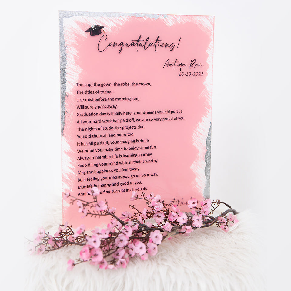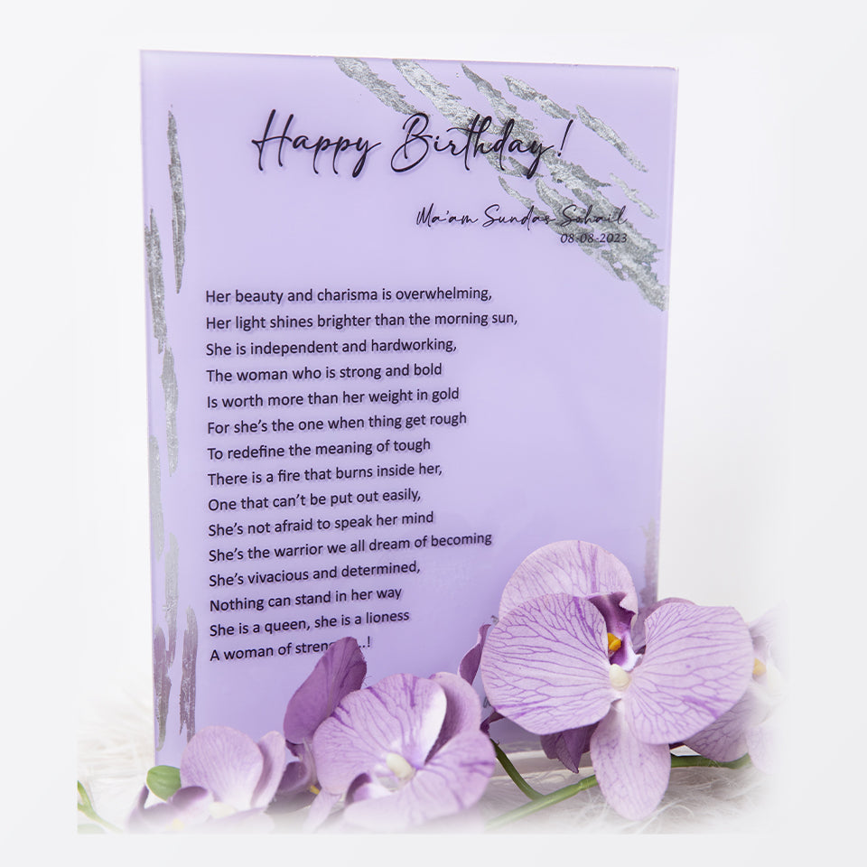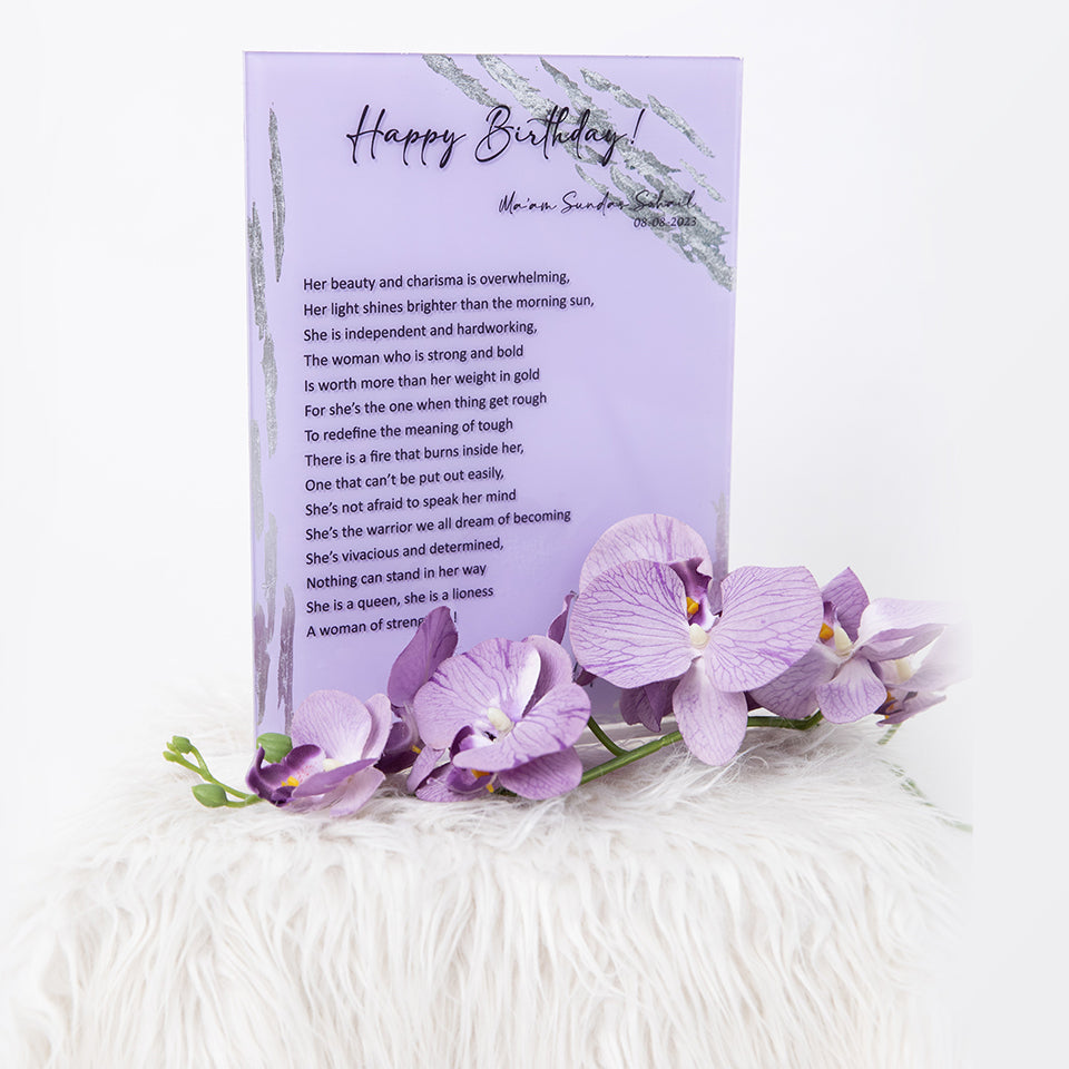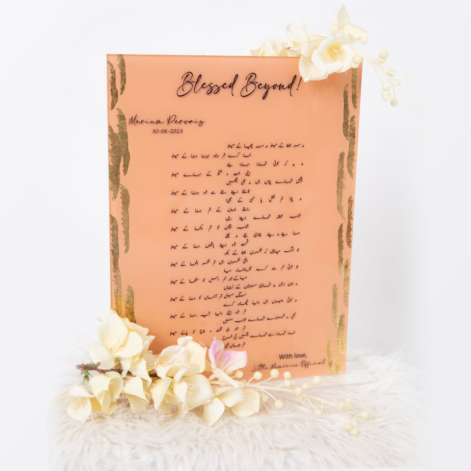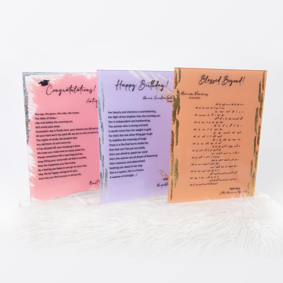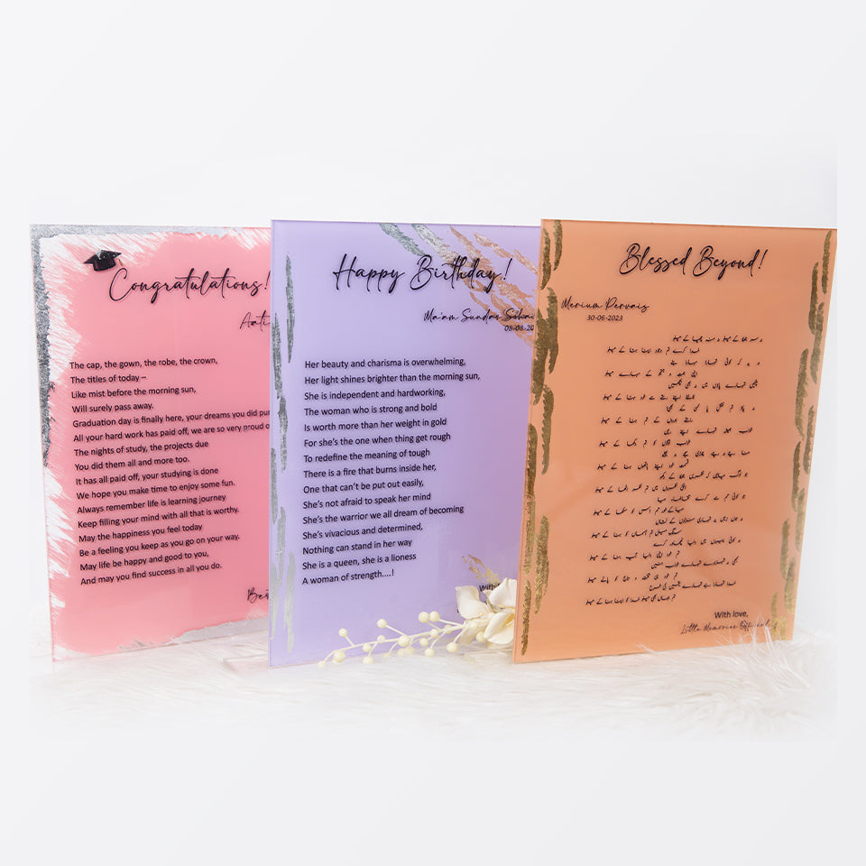 Each plaque is not just a decorative piece; it serves as a canvas for your feelings, beautifully printed and displayed on an elegant acrylic stand. Each piece becomes a timeless reminder of the love and memories that bind us together.
